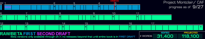 Hello again. I'm happy to say that the once-too-short chapter 5 has grown from 3,000 to 5,800 words. With that, I've finished editing the first of the novel's three sections... 26.6% of the total word count (probably closer to 24% when I'm done with all the chapters). I'm almost through the sections I flagged for heavy-editing... the ones that I wrote in my less experienced days (mere months ago) and that I now decided needed new content. Hopefully, chapters 7 and up will need less work and I can fly through them.