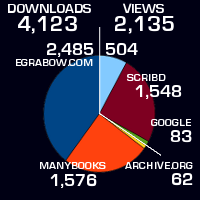 As I inch closer to print publication, these numbers are certainly encouraging. Of course, 6,200 views/downloads wouldn't necessarily translate to 6,200 sales, or even 6,200 readers. Google, Scribd, and this site's chapter 1 preview are counted as "views," which are easily inflated (especially on Scribd): someone who doesn't read the entire book in one sitting (everyone) will be counted each time they come back to read more, so a chapter-a-day reader on Scribd will be counted 17 times :) Manybooks, the Internet Archive, and egrabow.com, on the other hand, are downloads: a more reliable, and still impressive, number.